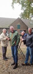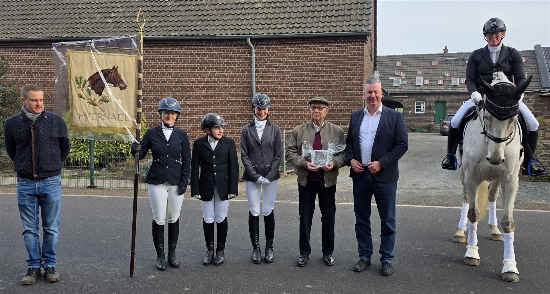 Jörg Gierling, Anne Harting und Luisa Nederkorn vom Reit- und Fahrverein Graf von Schmettow Eversael bedanken sich bei Norbert Kubik und Nils Schwenner von der Sparkasse am Niederrhein. Die ermöglichte mit einer 3.000-Euro-Spende die Anfertigung eines neuen Sprungs zu Ehren von Isabell Werth. Darüber freut sich auch Tanja Lechsner auf dem neunjährigen Flash.