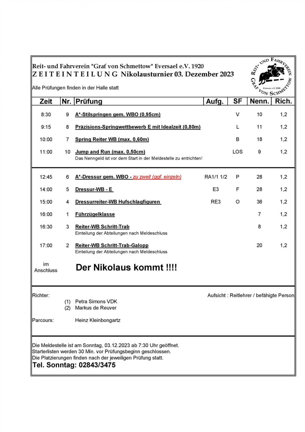 Am zweiten Advent hat das Nikolausturnier des RFV Graf von Schmettow Eversael stattgefunden. Dieses traditionsreiche, familiäre Turnier steht ganz im Zeichen des Reiternachwuchses. Zehn Wettbewerbe standen zur Auswahl – von der Führzügelklasse bis zu Spring- und Dressurwettbewerben der Kl. A*. 145 Nennungen sind im Vorhinein eingegangen. Damit haben wir die Nennungszahlen des Vorjahres beinahe wieder erreichen können. Fleißige Helferlein haben die Halle an den Tagen zuvor weihnachtlich geschmückt – für den Nikolausbesuch sollte es schließlich eine stimmungsvolle, weihnachtliche Atmosphäre geben. Dann konnte es Sonntag um 9.00 Uhr mit der ersten Prüfung los gehen.