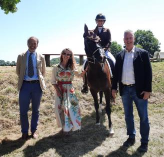 Jörg Gierling, Anne Harting und Luisa Nederkorn vom Reit- und Fahrverein Graf von Schmettow Eversael bedanken sich bei Norbert Kubik und Nils Schwenner von der Sparkasse am Niederrhein. Die ermöglichte mit einer 3.000-Euro-Spende die Anfertigung eines neuen Sprungs zu Ehren von Isabell Werth. Darüber freut sich auch Tanja Lechsner auf dem neunjährigen Flash.